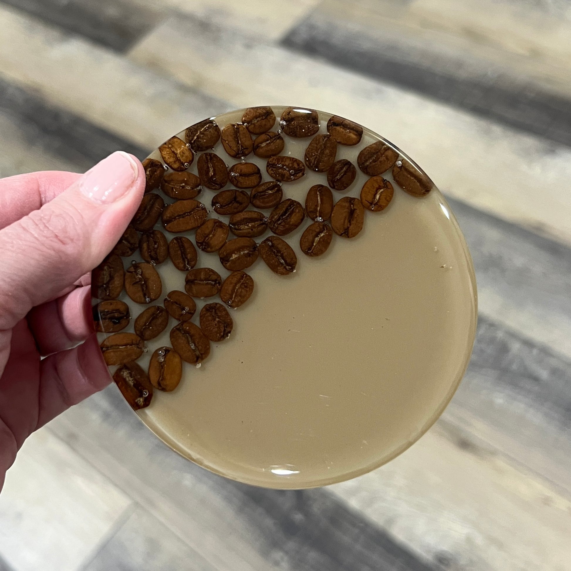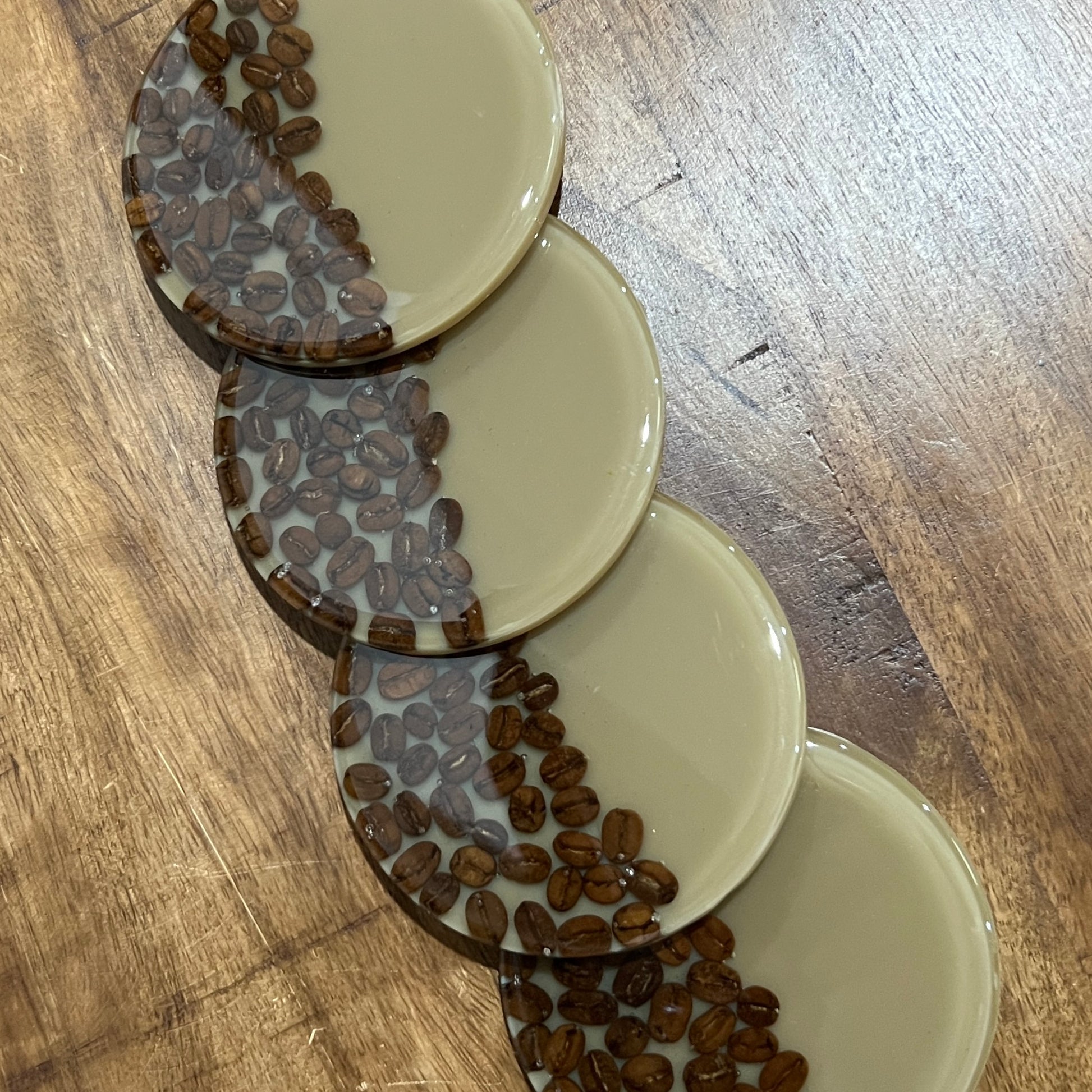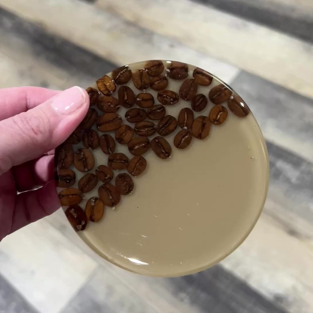 Fun fact: Coffee beans float in resin. We poured a little too deep and spent 45 minutes nudging each one back into place—so yes, these coasters are made with patience and caffeine.