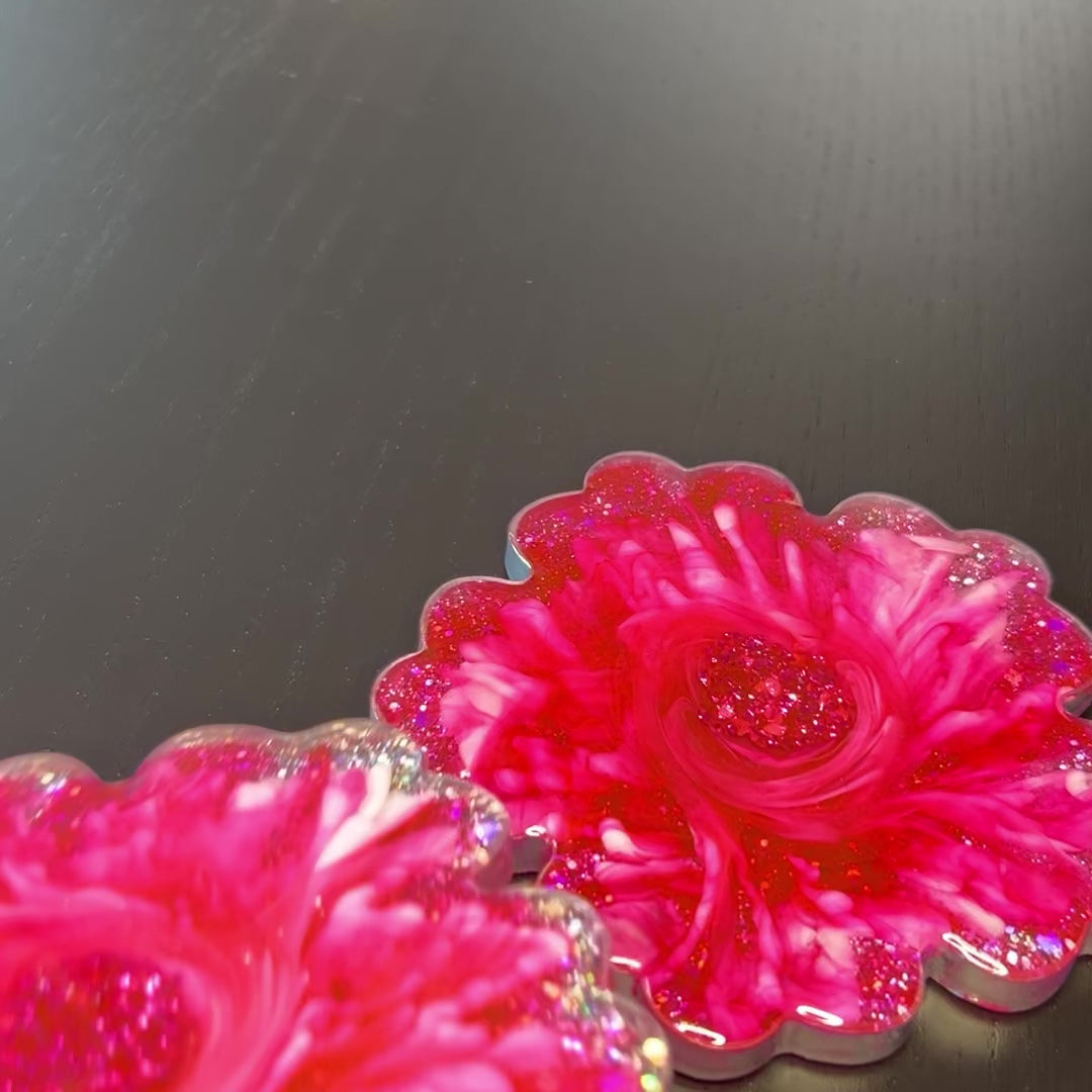Make your space pop with this playful set of four handmade resin coasters. These bright pink coasters are poured using a bloom technique that creates petal-like movement in each piece. The floral shape is outlined with hand-painted silver edges, sealed in clear resin for lasting shine and durability. The backs are filled with glitter-infused resin that adds a dazzling touch from every angle.